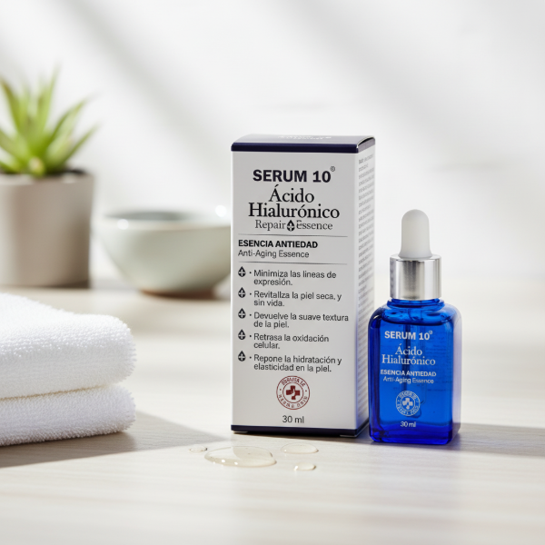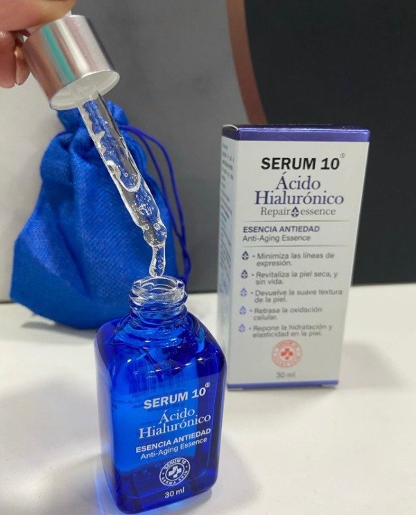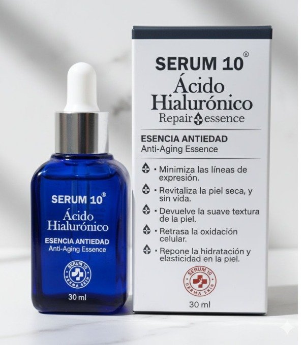 El Sérum 10® Ácido Hialurónico es una esencia facial anti-age formulada para brindar hidratación profunda, reparación cutánea y revitalización de la piel, ayudando a mejorar visiblemente los signos del envejecimiento.