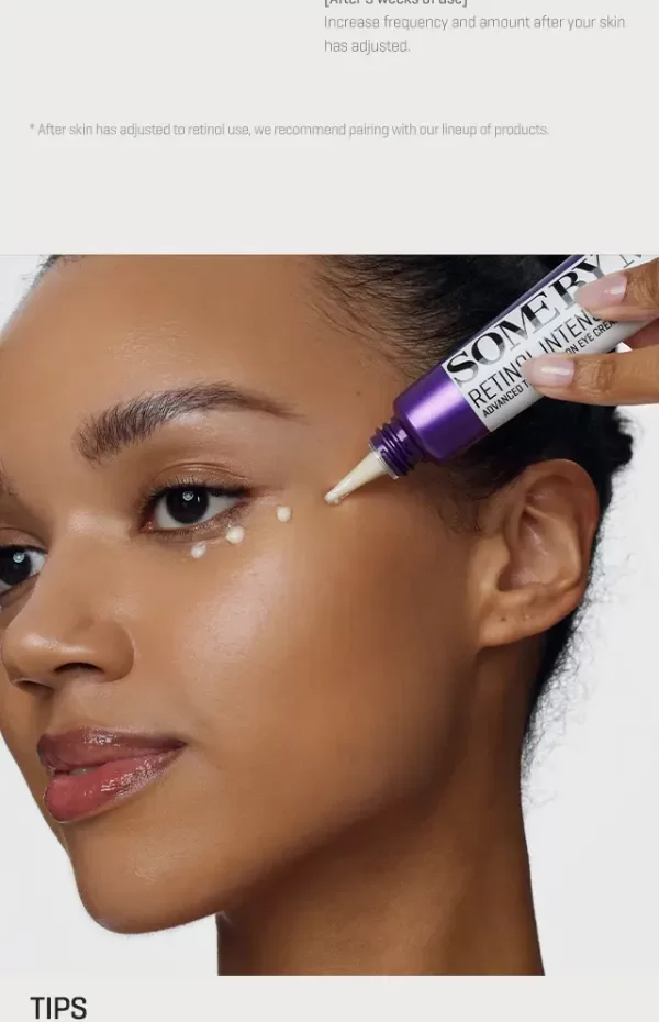 Aplique de 1 a 2 gotas del tamaño de un grano de arroz Some By Mi Retinol Intense Advanced Triple Action Eye Cream 30ml por la noche. En las primeras 1-2 semanas, aplíquelo una vez al día por la noche o cada 2 días en caso de piel sensible. Después, puede aumentar la frecuencia.