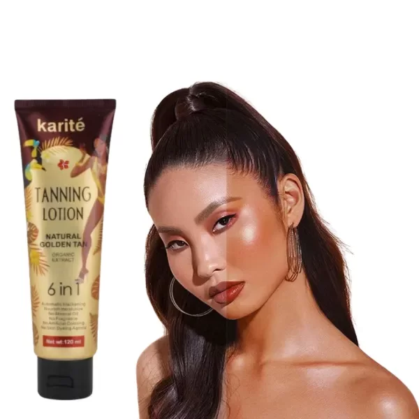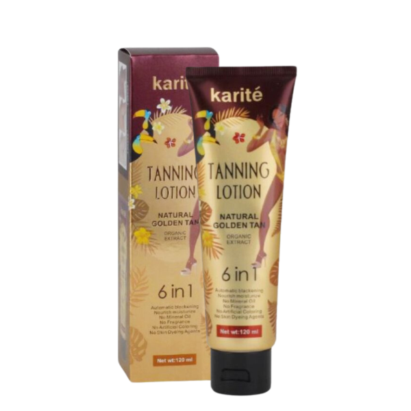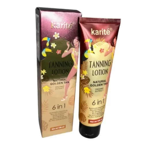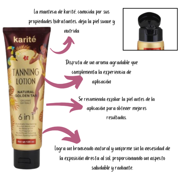 La Karité Tanning Lotion 6 en 1 es una crema bronceadora especialmente diseñada para lograr un tono dorado natural, realzar la luminosidad de la piel y proporcionar hidratación profunda. Su fórmula con extractos orgánicos permite un bronceado progresivo, uniforme y sin resecar la piel, ideal tanto para uso personal como profesional.
